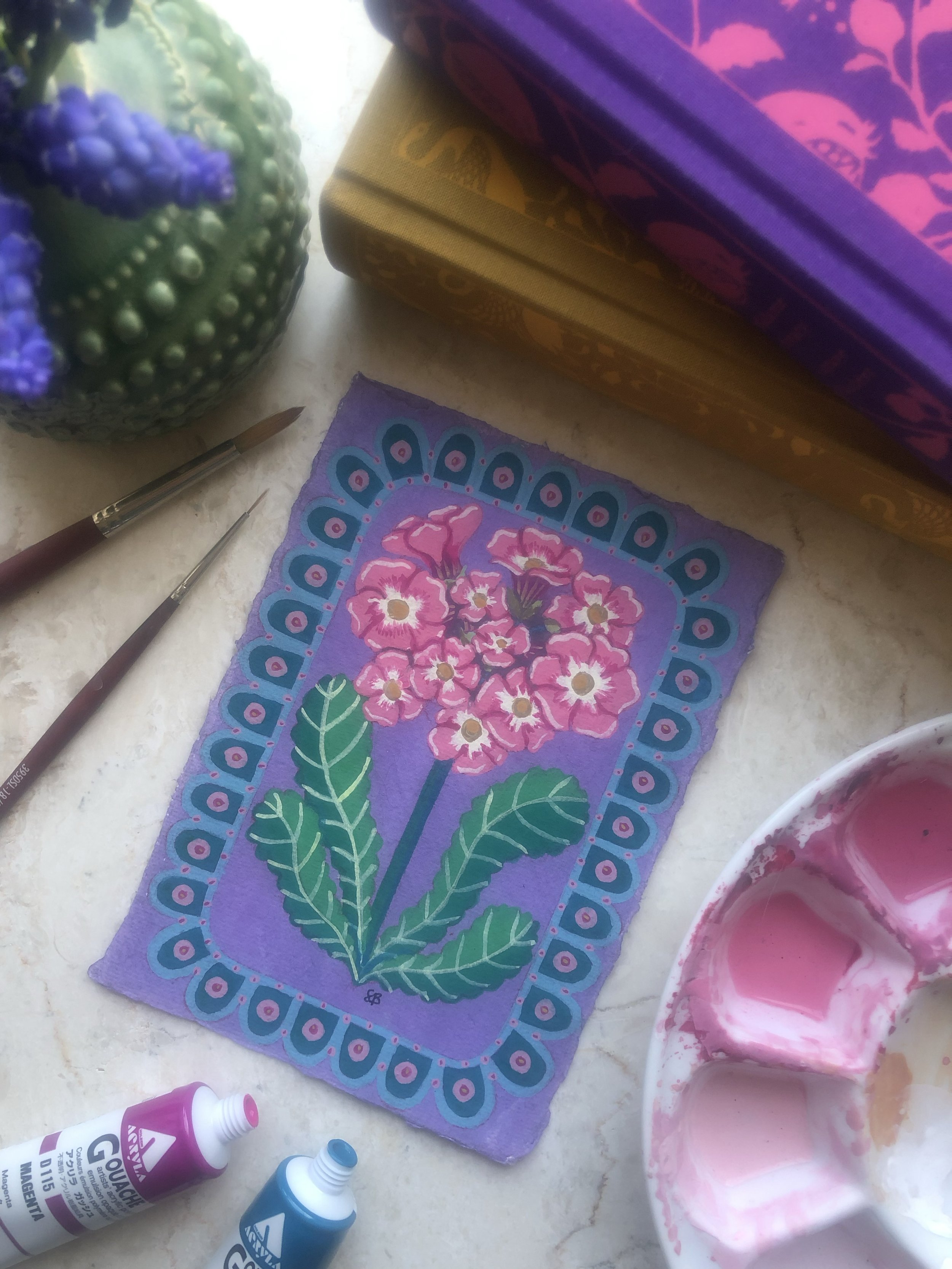 My work has a tendency to be in rich jewel-like colours often infused with florals and elements from nature. Painting is how I express the beauty that I see in our world, and I love to share that with others in the hope it might lift someone’s spirits and bring them joy! I’m particularly drawn to flowers, which I find either in the hedgerows around my home or growing in my little cottage garden, returning to them as a way of understanding both their structure and their decorative potential.